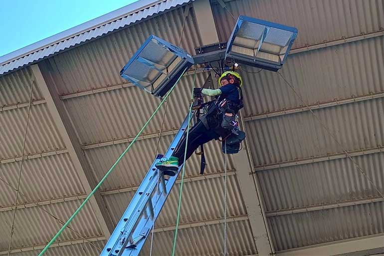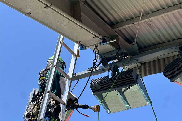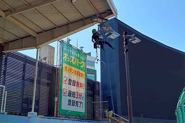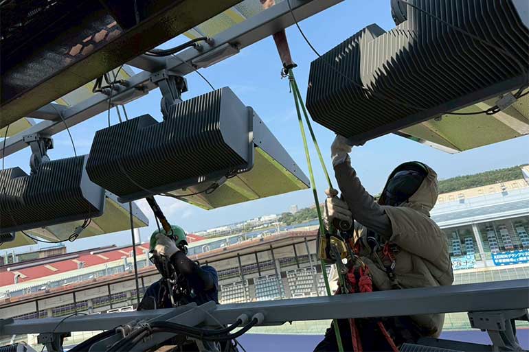 2025年7月16日 競輪場の照明清掃を行いました。 照明塔へ上がるためのタラップはあるものの、照明器具の清掃には身を乗り出さなければなりません。 ハシゴを掛けた部分も観客席があるため足場は悪く、ロープアクセスの技術でより安全に作業をすることができました。 所在地 神奈川県 物件概要 競輪場 工事内容 照明清掃 カテゴリー その他 タグ 照明工事高圧洗浄・清掃